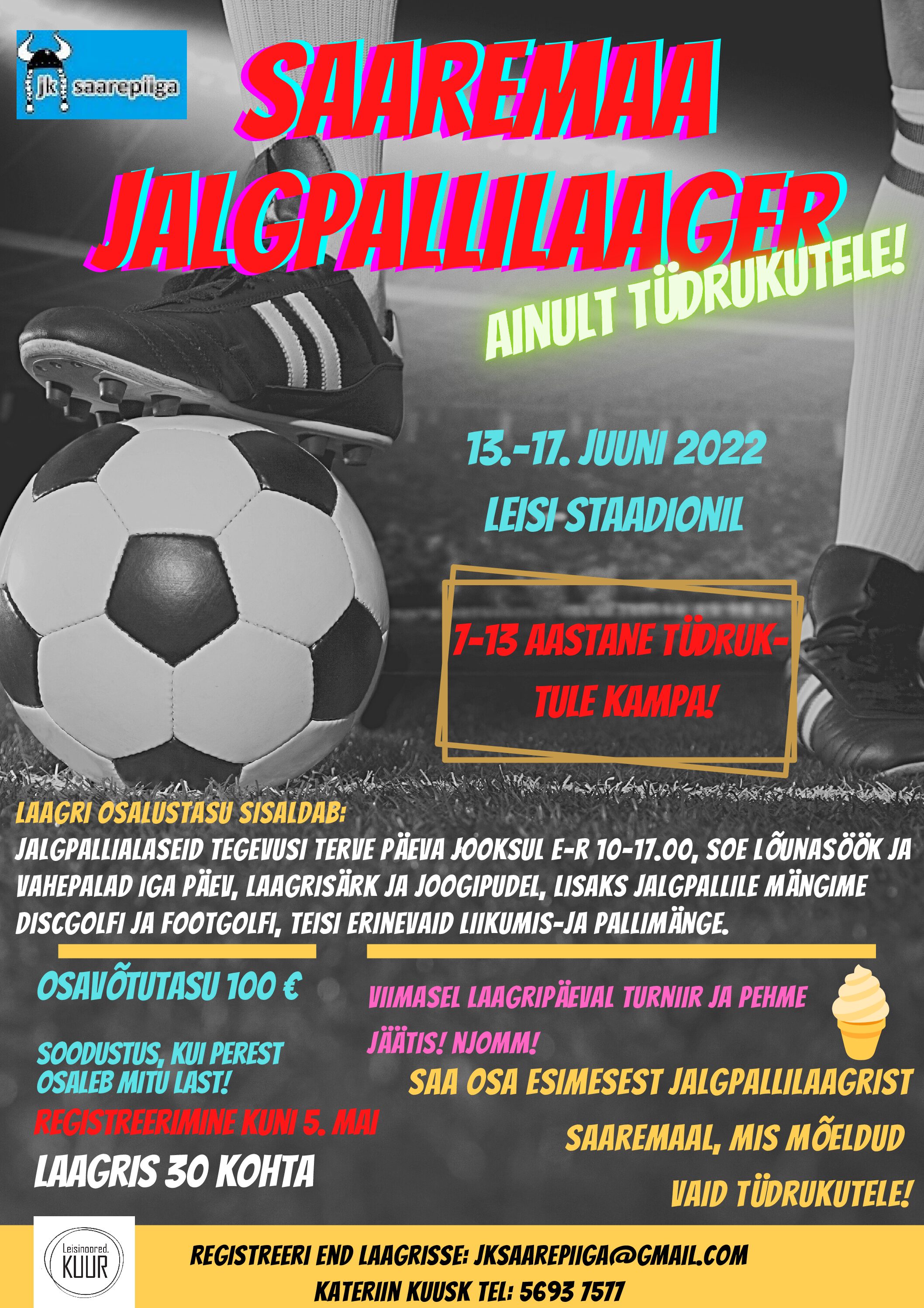 JK Saarepiiga2022-04-07T12:10:47+03:0013.-17. juunil toimub Leisi staadionil vaid tüdrukutele mõeldud jalgpallilaager! Tule saa osa erinevatest toredatest mängudest ja võistlustest, söö jäätist, roni [...]